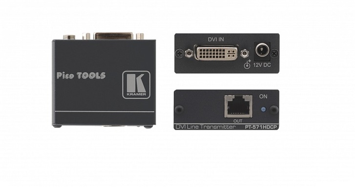 PT-571HDCP - передатчик сигнала DVI-D по кабелю на витой паре. Он преобразует сигнал DVI в формат, пригодный для такой передачи. Обратное преобразование выполняет приемник PT-572HDCP+.
