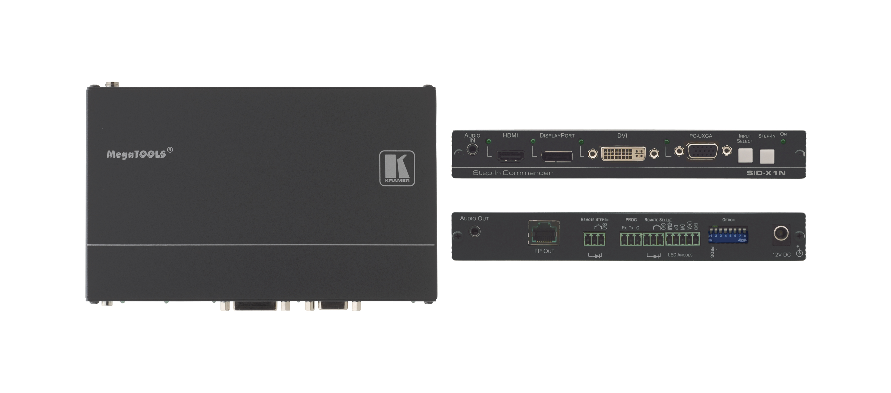 SID-X1N - передатчик по кабелю на витой паре DGKatTM с функцией дистанционной активации для сигналов VGA, HDMI, DVI, DisplayPort и небалансного стереофонического аудиосигнала. В приборе имеется управляющая функцией дистанционной активации кнопка "Step-In", которая дает возможность вывести сигнал подключенного к нему источника через главный коммутатор на основной дисплей.